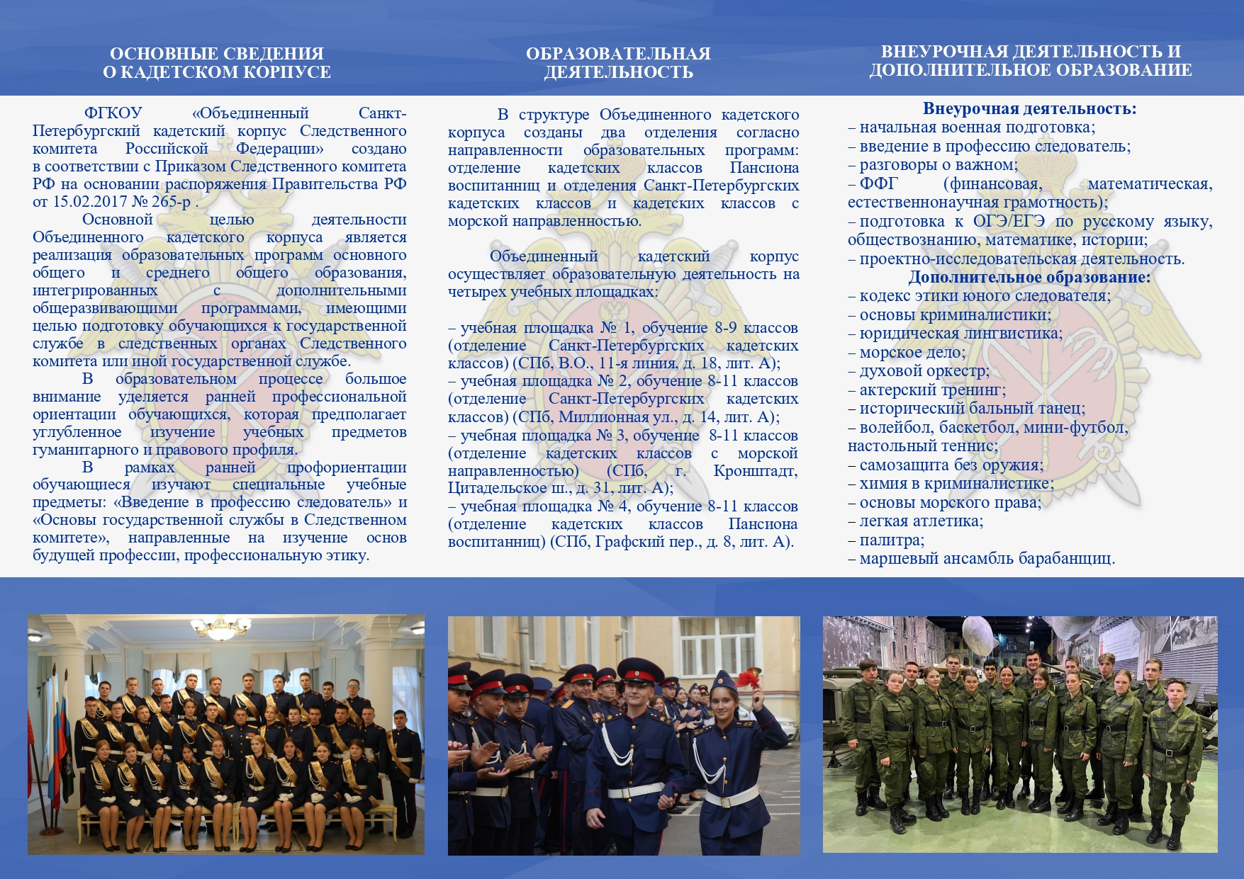 Федеральное государственное казенное общеобразовательное учреждение «Объединенный Санкт-Петербургский кадетский корпус Следственного комитета Российской Федерации» (далее – Объединенный кадетский корпус) информирует об осуществлении набора кандидатов на 2024-2025 учебный год в 8, 9, 10 классы, имеющих 1 или 2 группу здоровья, основную медицинскую группу для занятий физической культурой.